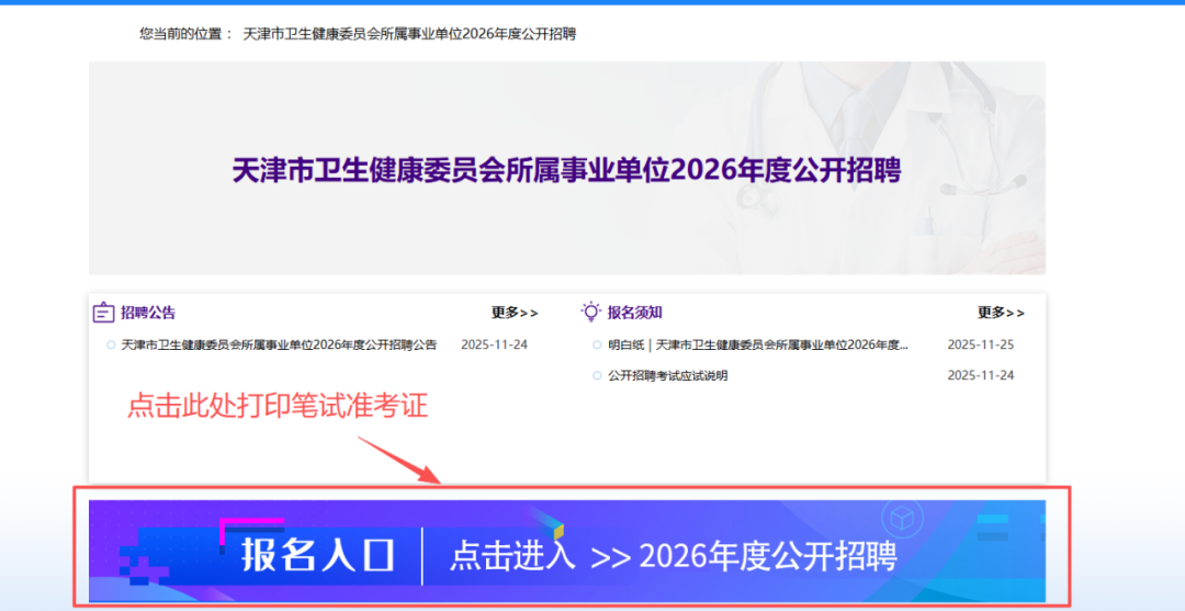 1.笔试准考证打印时间为2026年1月7日9:00起,请考生及时在规定时间内登录报名网站天津卫生人才网(www.tjwsrc.com)打印,以免错过考试。
